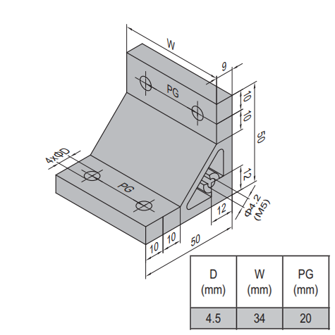 This product is a AP Bracket 50×50-PG20-40 (Set). The bracket is a product that allows you to connect two elements to each other at a specific angle. The brackets come in a very wide variety of angles to suit multiple applications, based on what the consumer might need. It offers strength and durability to angular connections that often prove difficult otherwise. The brackets are made of anodized aluminum and strengthens angular connections while also offering a more finished or professional look. This product includes a fastening set.