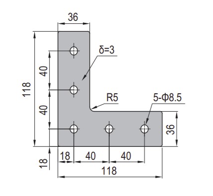 This product is a joining plate l-shape, which is a connecting element. The plate is used to connect extrusion with a different profile. The plate is in the shape of an L, which consequently means it can be used to connect profiles at a 90 degree angle. The plate is placed on top of the two elements, and then fastening elements are used to connect the plate to the two profiles. For extra sturdiness and also durability, it is best to connect plates on both sides of the profiles.