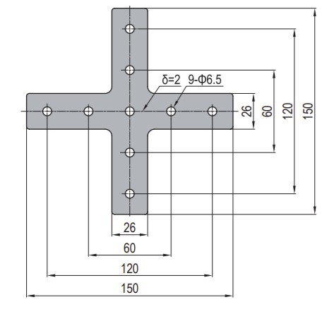 This product is a joining plate t-shape, which is a connecting element. The plate is used to connect extrusion with a different profiles. The plate is in the shape of a plus, which consequently means it can be used to connect four profiles, with each corner being 90 degrees. The plate is placed on top of the four elements, and then fastening elements are used to connect the plate to the two profiles. For extra sturdiness and also durability, it is best to connect plates on both sides of the profiles.