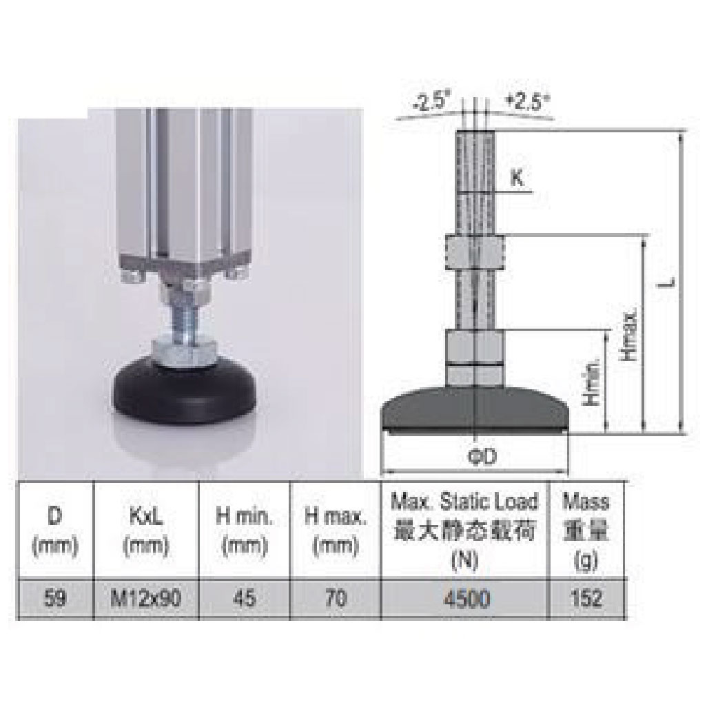Base: Black PA6, Spindle: Zinc-plated Steel, Pad: Black Rubber. Size: M12x90